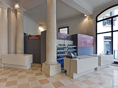 Reception in MDF laccato con sviluppo in profondità, permettendo il comodo stoccaggio degli articoli come merchandising, cataloghi e brochure. Dotato di ripiani nella parte interna.